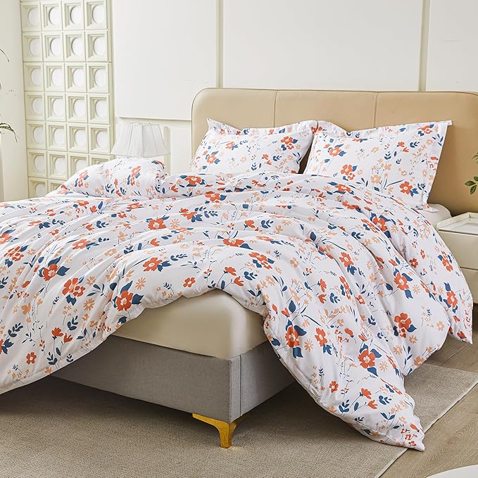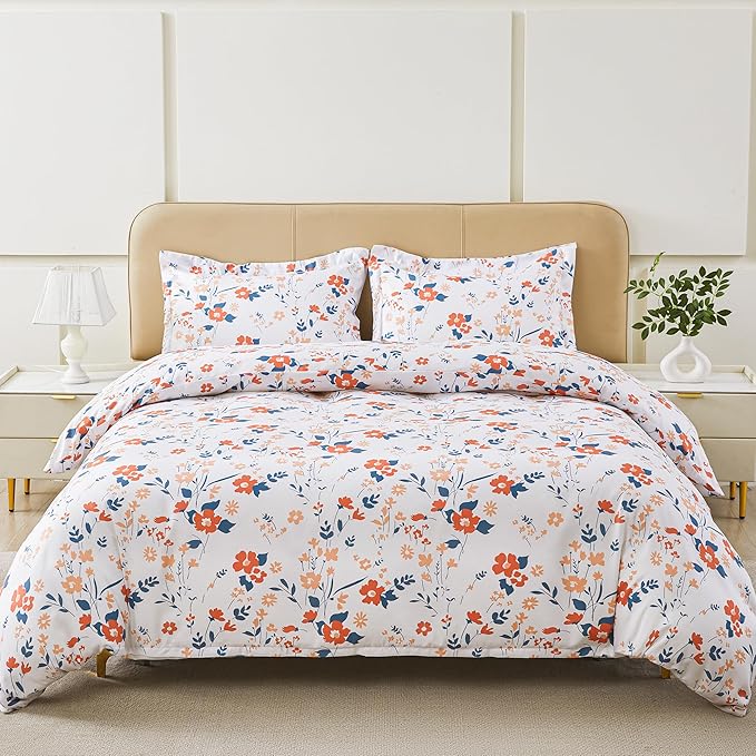 Floral Duvet Cover Queen Size, Orange Flower Zipper Closure Duvet Cover Set, Soft Microfiber Flower Printed Bedding Set with 4 Ties