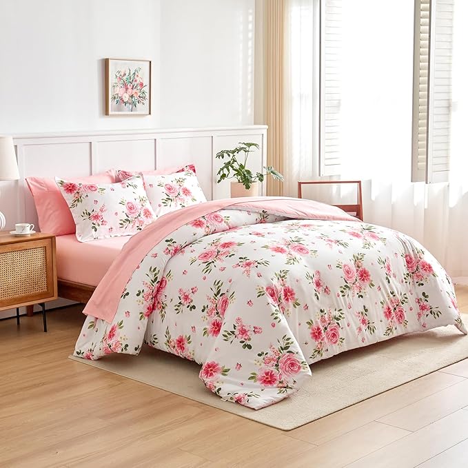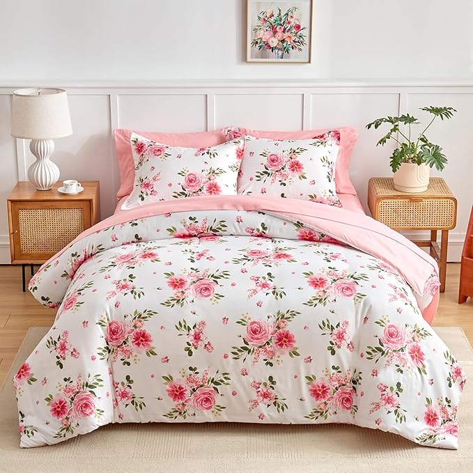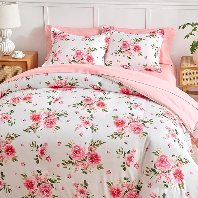 Style: White Duvet Cover with Colorful Pink Rose flowers and green leaves,Pink Reversible Side. Cute and Colorful botanical style makes the comforter super great and bright for all season - . Nice Birthday gift for girls women, Gift choice for any holiday! Summer Duvet Cover Bedding design, Just open it.